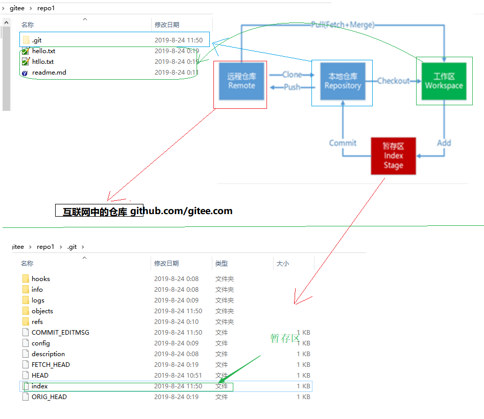 暂存区: 在 本地仓库中的一个特殊的文件(index) 叫做暂存区,临时存储我们即将要提交的文件